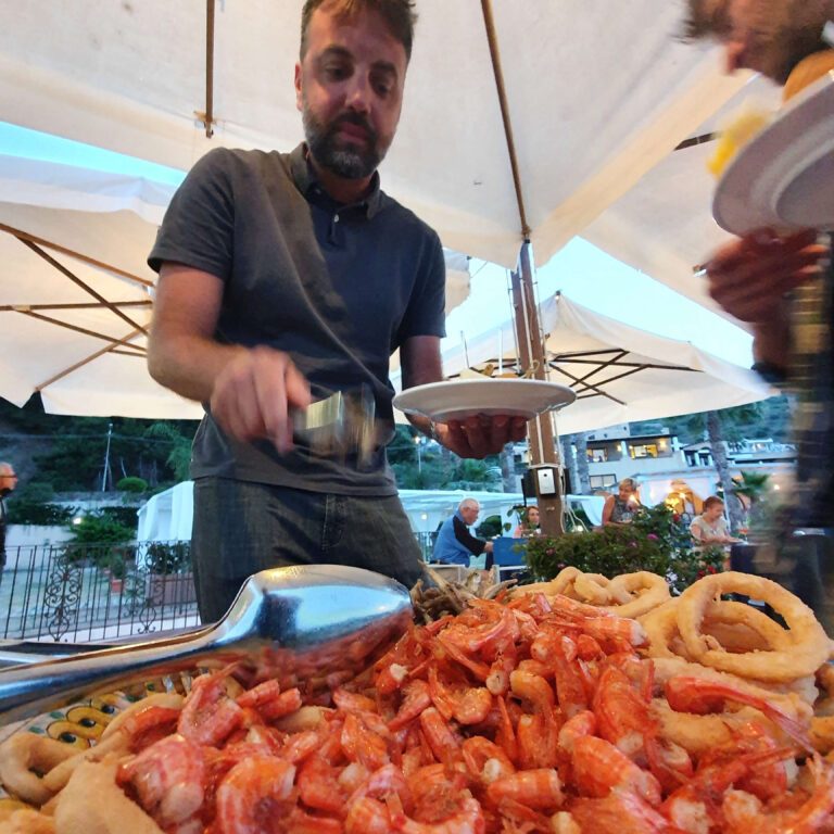 From the fishermen of Riomaggiore to the beachside restaurants of Camogli, the sea is always the star of the table. Expect stuffed mussels, fried calamari, anchovies, seafood soups, and the iconic cappon magro, a colorful layered dish of fish and vegetables. One of the highlights? Dining right by the sand in Camogli, with waves almost at your feet.