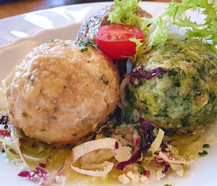 These are rather large gnocchi made with stale bread, soaked in milk, then enriched with eggs, aromatic herbs and sautéed speck and onion. Belonging to the peasant tradition, canederli are born as a poor and recycled dish, to avoid throwing away old, now stale bread. You can taste them in a rich and tasty meat broth. Or you can dress them with melted butter or a delicious tomato sauce.