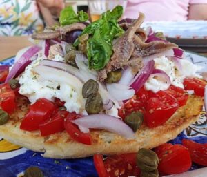 rustic bread topped with tomatoes, anchovies, capers, pecorino, and olive oil. A peasant dish turned gourmet.